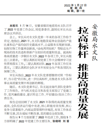 安徽局sgndf拉高标杆推进高质量发展——见2022年1月27日中煤地质报第二版