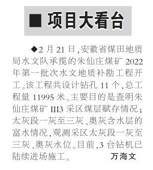 安徽局sgndf承揽朱仙庄煤矿水文地质补勘工程开工——见2022年3月14日中煤地质报第二版