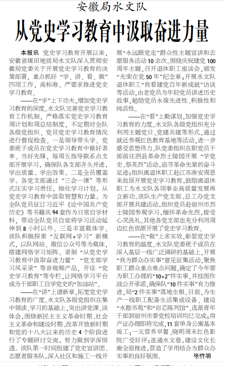 安徽局sgndf从党史学习教育中汲取奋进力量——见2021年8月5日中煤地质报第三版