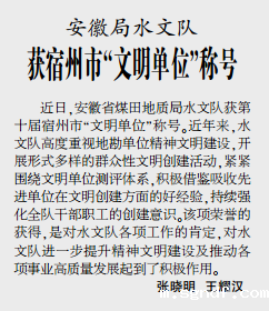 安徽局sgndf获宿州市“文明单位”称号——2020年1月20日中煤地质报第三版