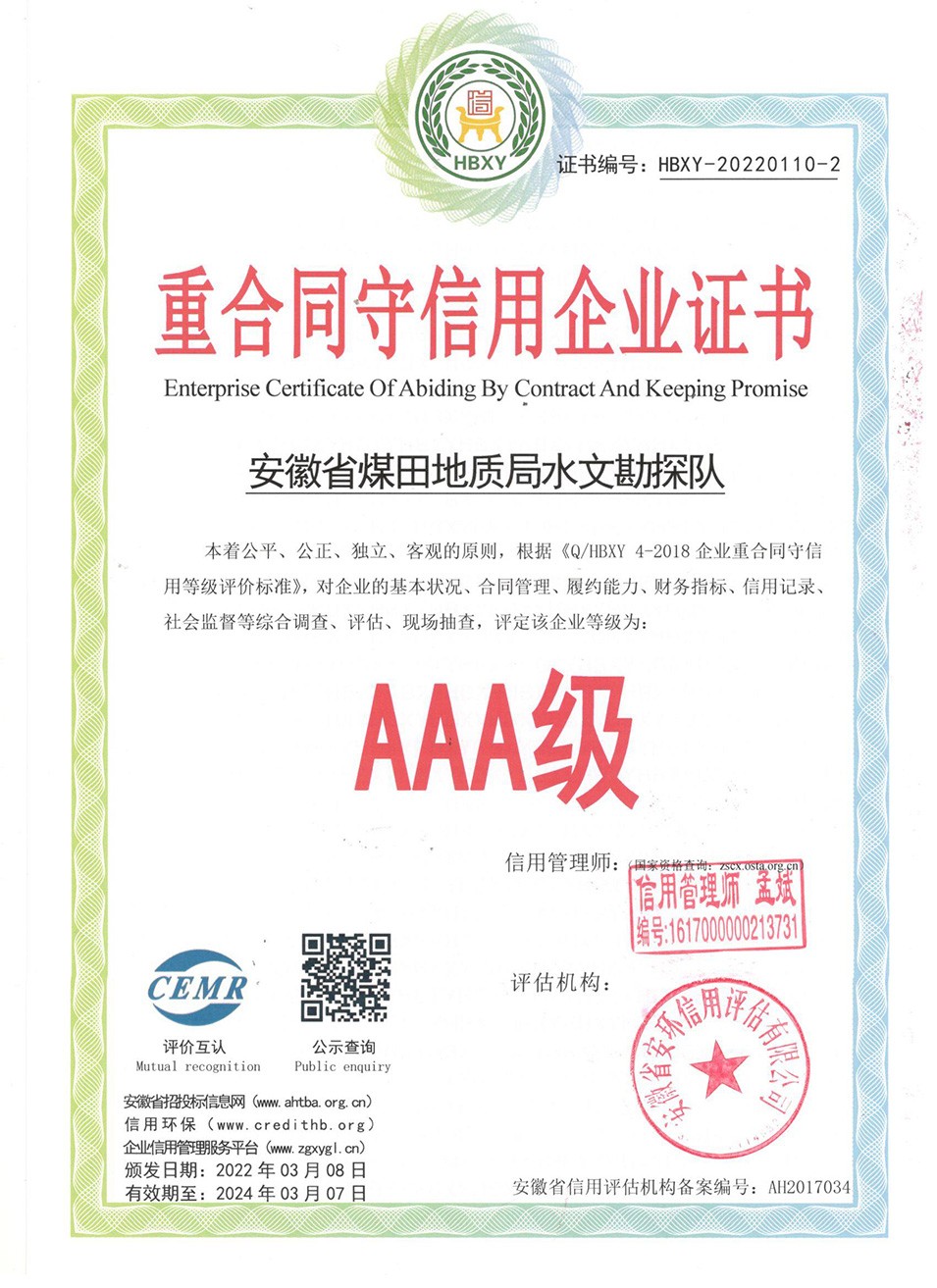 AAA级重合同守信用企业