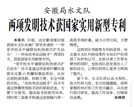 安徽局sgndf两项发明技术获国家实用新型专利——见2019年8月19日中煤地质报第二版