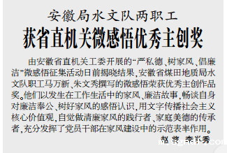 安徽局sgndf两职工获省直机关微感悟优秀主创奖――见2019年2月21日中煤地质报第三版