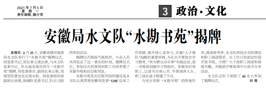 安徽局sgndf“水勘书苑”揭牌——2021年7月5日中煤地质报三版头条