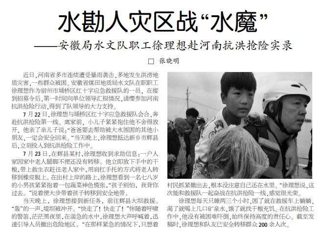水勘人灾区战“水魔”——安徽局sgndf职工徐理想赴河南抗洪抢险实录(见2021年8月2日中煤地质报二版)
