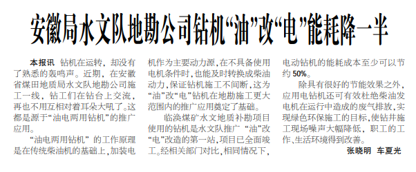 安徽局sgndf地勘公司钻机“油”改“电”能耗降一半——见2021年8月23日中煤地质报第二版