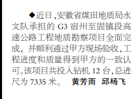 安徽局sgndfG3宿州至固镇段高速公路工程地质勘察项目完工——见2022年6月20日中煤地质报第二版